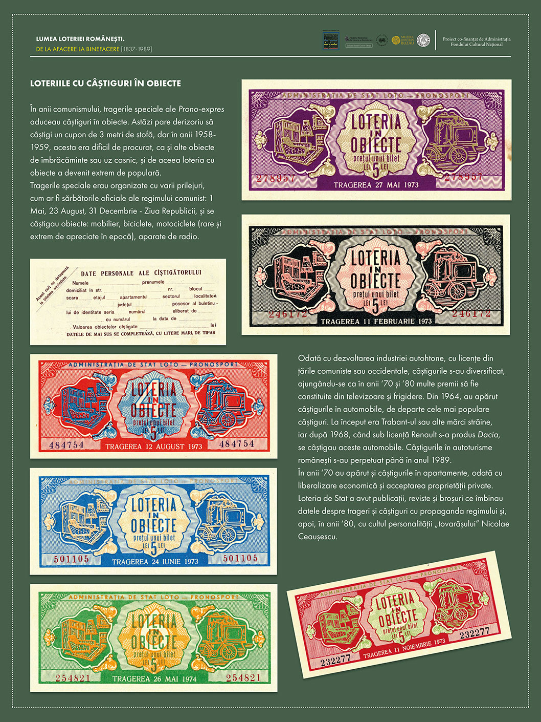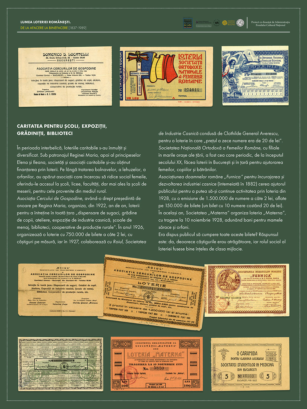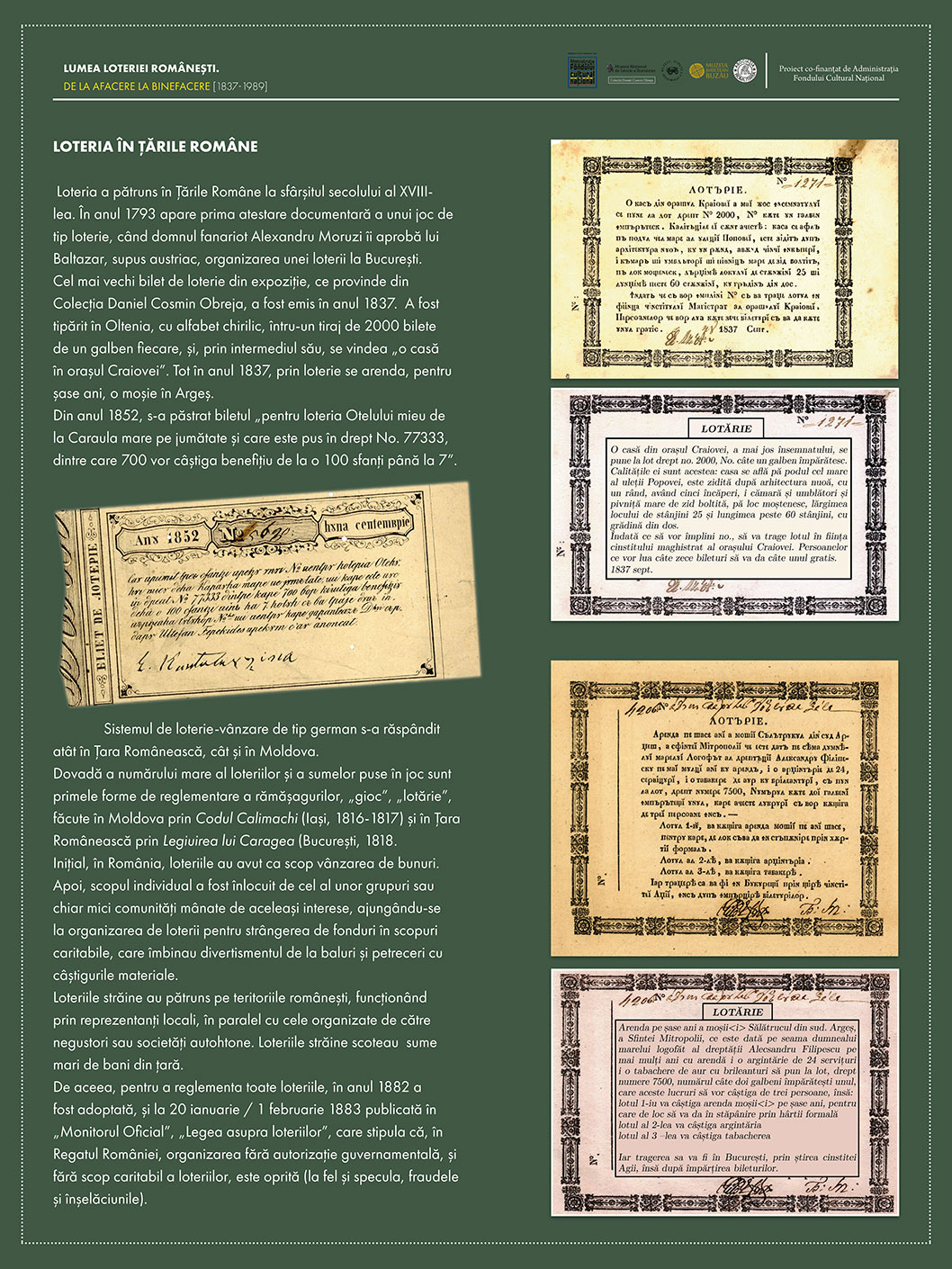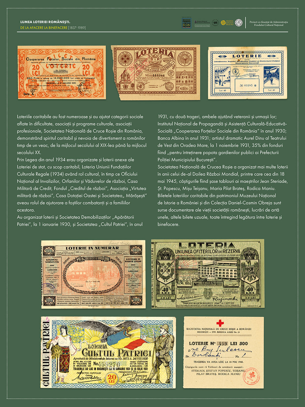 Proiectul „Lumea loteriei românești: de la afacere la binefacere (1837-1989)”, cofinanțat de către Administrația Fondului Cultural Național (AFCN), Proiecte Culturale, sesiunea II/2025, Patrimoniu Cultural Material, cu suma de 160.622 lei, își propune diversificarea audienței muzeelor și cultivarea interesului și respectului pentru patrimoniul național prin apelul la tandemul colecții particulare – muzee.